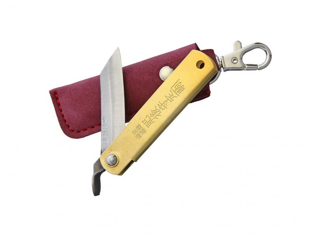 Hagyományos japán Higonokami összecsukható kés 5,2 cm-es pengével és sárgaréz markolattal. A Warikomi módszerrel készült rétegacélból készült penge - az Aogami szénacél (kék papíracél) kemény magját lágyabb vas oldalai veszik körül. Piros bőr tok karabinerrel akasztáshoz.