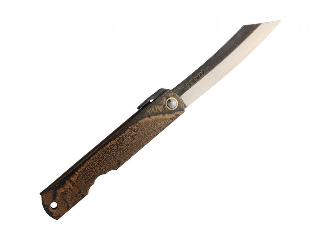 Hagyományos japán Higonokami összecsukható kés 7,5 cm-es pengével és bronzbarna vas markolattal. A Warikomi módszerrel készült rétegacélból készült penge - az Aogami szénacél (kék papíracél) kemény magját lágyabb vas oldalai veszik körül.