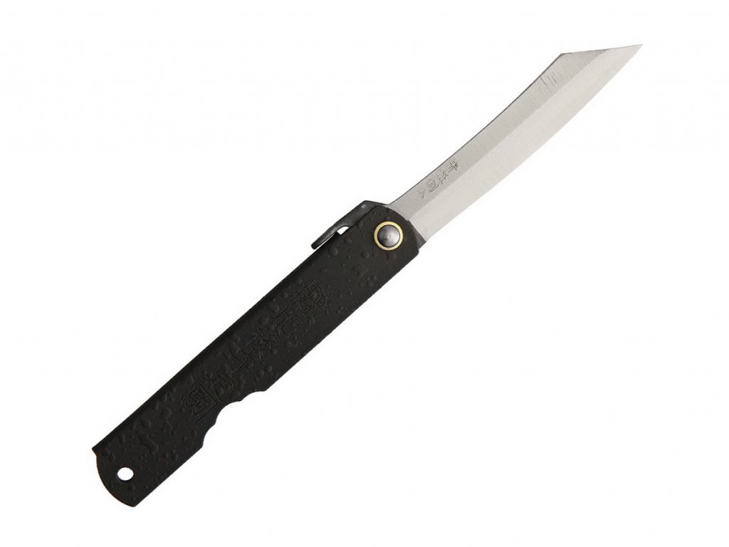 Hagyományos japán Higonokami összecsukható kés 7,5 cm-es pengével és fekete vas markolattal. A Warikomi módszerrel készült rétegacélból készült penge - az Aogami szénacél (kék papíracél) kemény magját lágyabb vas oldalai veszik körül. A penge matt felületű.