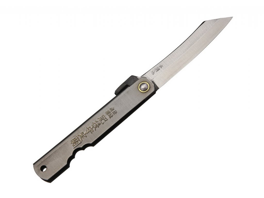 Hagyományos japán Higonokami összecsukható kés 6,5 cm-es pengével és fekete rozsdamentes acél markolattal. 6,5 cm hosszú, Warikomi módszerrel készült rétegacél penge - az SK5 szénacél kemény magot lágyabb vas oldalai veszik körül.