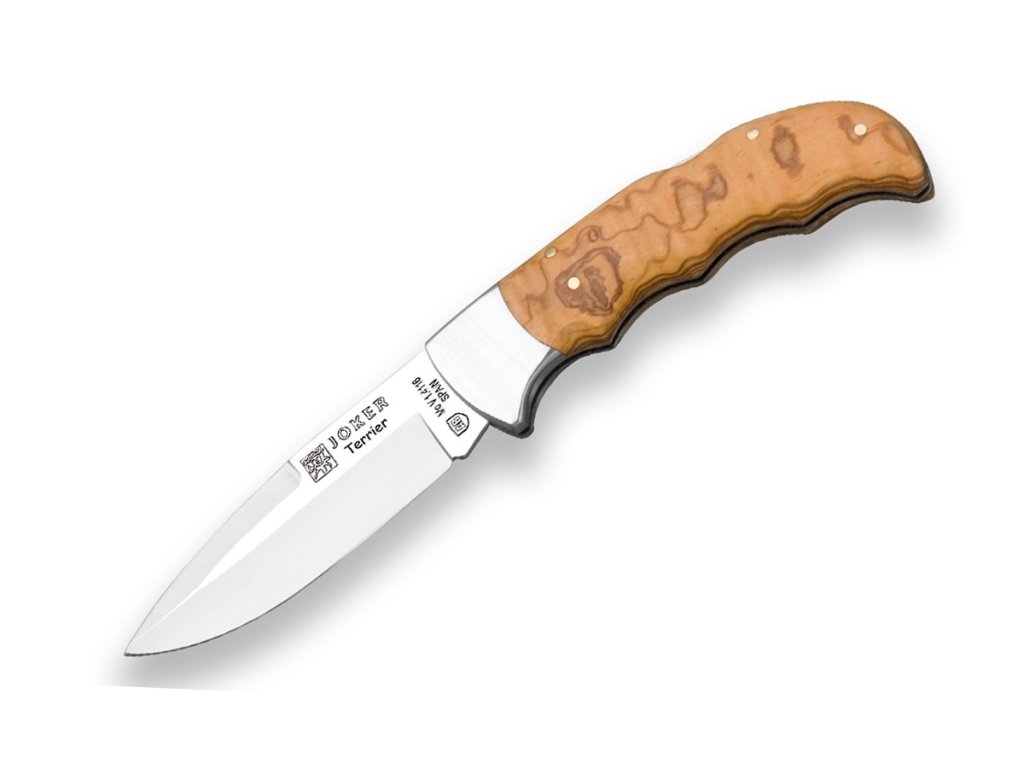 A masszív Joker Terrier NO19 összecsukható kést vadászatra és erdei vadászati tevékenységekre tervezték. A kés ideális társ hétvégi kempingezéshez, bushcrafthoz vagy horgászathoz. A markolat olívafával díszített. Hagyományos rozsdamentes X50CrMoV15 (1.4116) rozsdamentes acélt használtak a drop pointhoz. Masszív penge matt felületkezeléssel. A vadászkés biztonsági berendezéssel van felszerelve a nem kívánt nyitás ellen (backlock). A fém támaszték megakadályozza a szennyeződés felhalmozódását. A kés teljes egészében Spanyolországban készült.