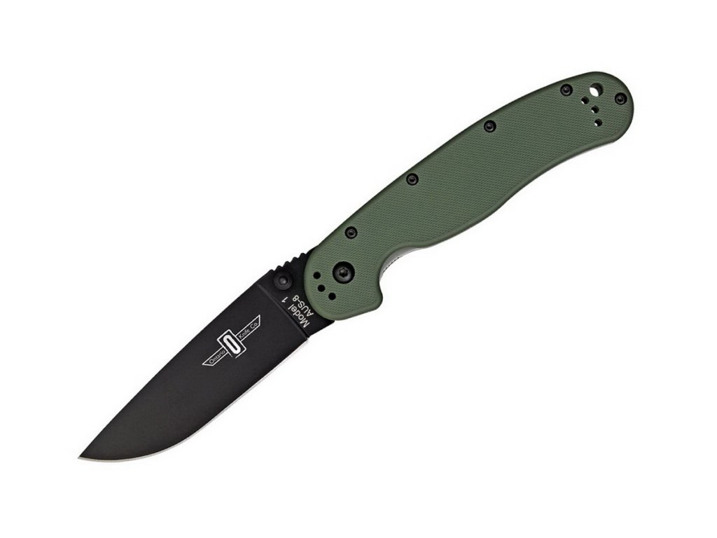 Az Ontario RAT-1 az Ontario Knife Company és a Randall's Adventure & Training együttműködésével jött létre. A RAT 1 egy mindennapi használatra szánt hajtogató kés, amely évek óta bevált. Az AUS-8 rozsdamentes acél penge fekete felületű és lapos élezésű. A 8,9 cm-es penge hossza és az drop point alakja kiváló univerzális zárókéssé teszi. Markolatk olivazöld nejlonból, acél markolattal, béléses zárral.A markolat nagyon jó fogású az ergonómikus formának és a mutatóujj markáns mélyedésének köszönhetően. A kés felakasztására szolgáló kapocs négy helyzetben megfordítható, és a kés egyaránt alkalmas jobbkezesek és balkezesek számára egyaránt.