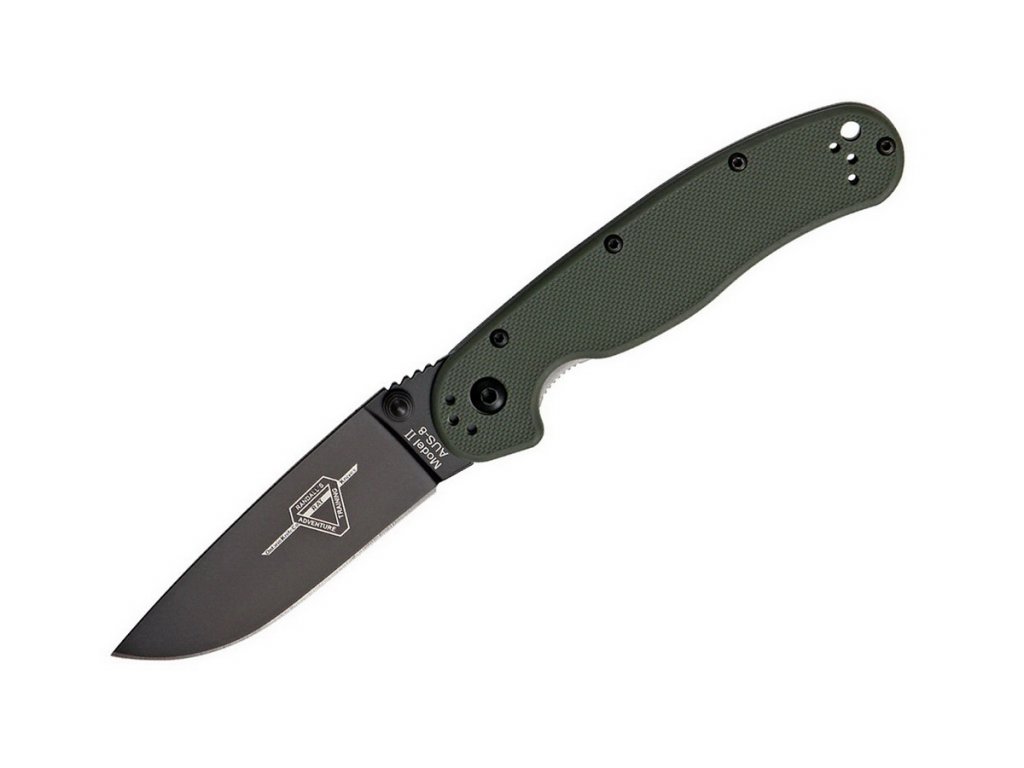 Az Ontario RAT-2 az Ontario Knife Company és a Randall Adventure & Training együttműködésével jött létre. A RAT 2 a RAT 1 modell egy kisebb változata, és a mindennapi használatra szánt zárható kés, amely évek óta bevált. A AUS-8 rozsdamentes acél penge fekete felületű és lapos élezésű. A 7,6 cm-es penge hossza és az drop point alakja kiváló kisebb zárható késsé teszi. Markolatk olivazöld nejlonból, acél markolattal, béléses zárral. A markolat nagyon jó fogású az ergonómikus formának és a mutatóujj markáns mélyedésének köszönhetően. A kés felakasztására szolgáló kapocs négy helyzetben megfordítható, és a kés egyaránt alkalmas jobbkezesek és balkezesek számára egyaránt.