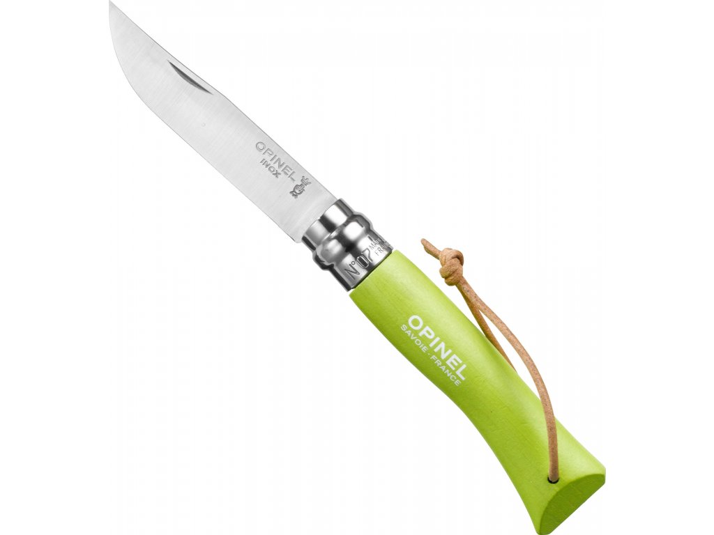 Praktikus összecsukható kés a francia Opinel márkától, 8 cm-es rozsdamentes acélpengével és bükkfából készült, zöld színű markolattal, amely bőr zsinórral van kiegészítve, a kés Viroblock biztonsági gyűrűt tartalmaz.Opinel