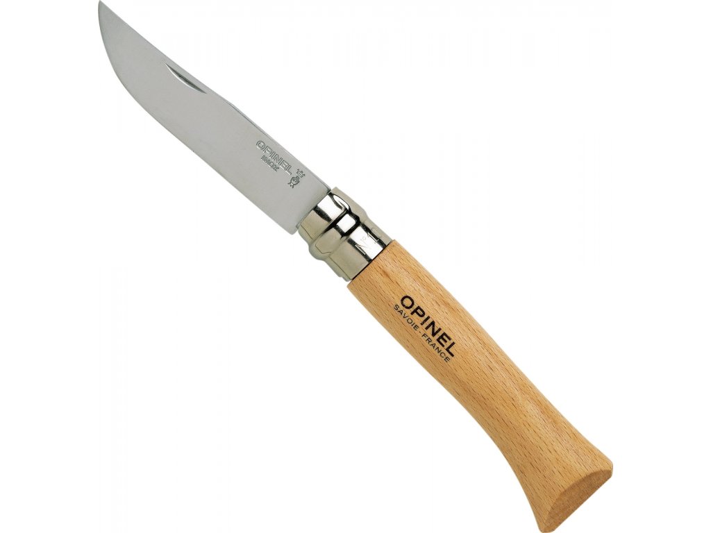 Praktikus összecsukható kés a francia Opinel márkától, 10 cm-es rozsdamentes acélpengével és bükkfából készült markolattal, a kés Viroblock biztonsági gyűrűt tartalmazOpinel