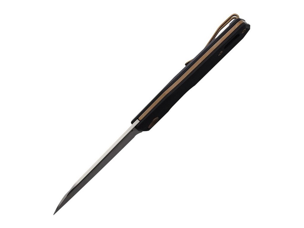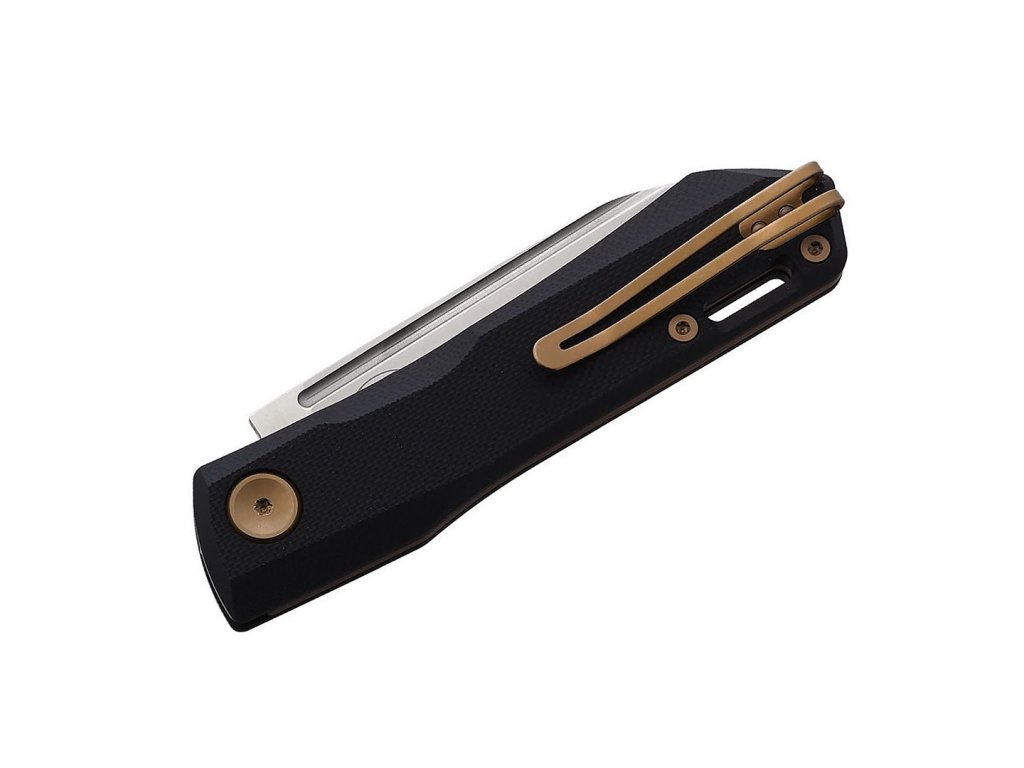 Fekete G10 markolat elegáns bronz ékezetekkel. A markolat szokatlan formájú, de ergonómiailag nagyon jó, és remekül fekszik a kézben. Zsebcsipesszel rendelkezik, amely lehetővé teszi a kés mélyen történő hordozását és egy kiemelkedő zsinórlyukkal.