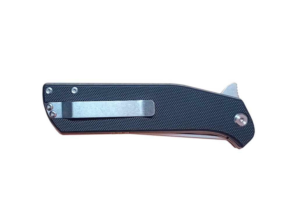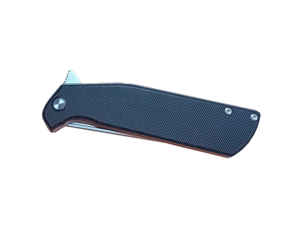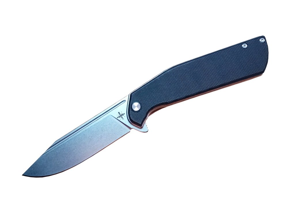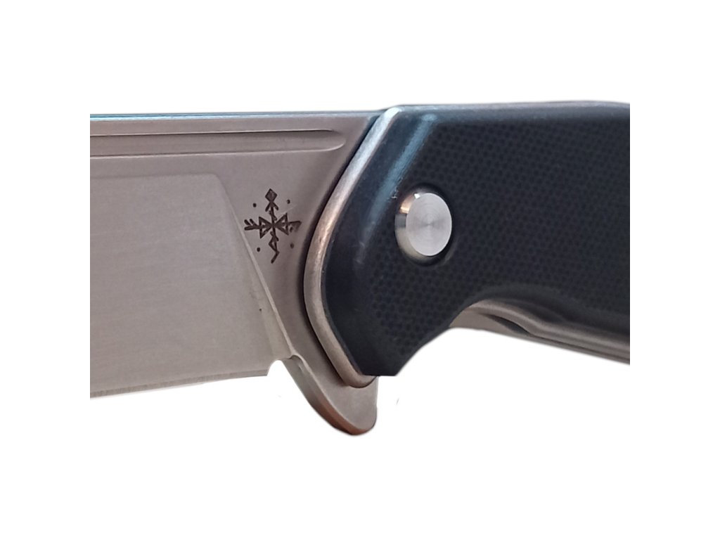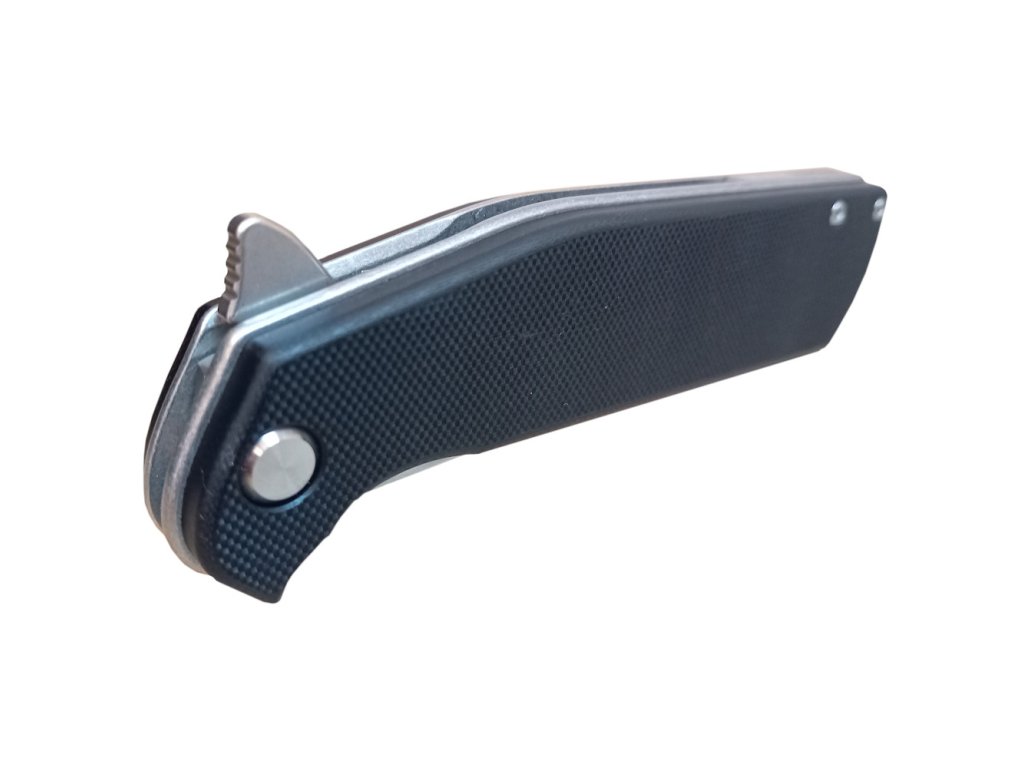 A texturált fekete G10-ből készült markolat szilárd és biztonságos fogást tesz lehetővé. A kés liner lockkal és acél zsebcsipesszel van felszerelve. Egykezes nyitás flipperrel.