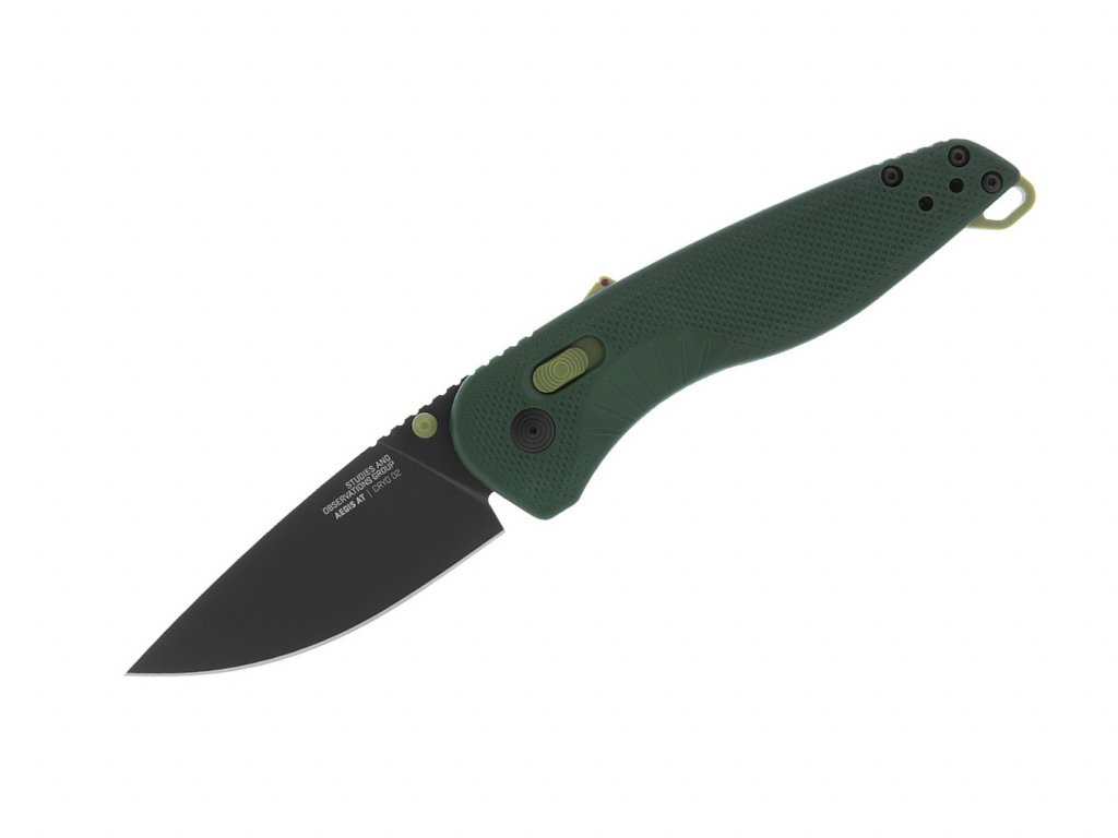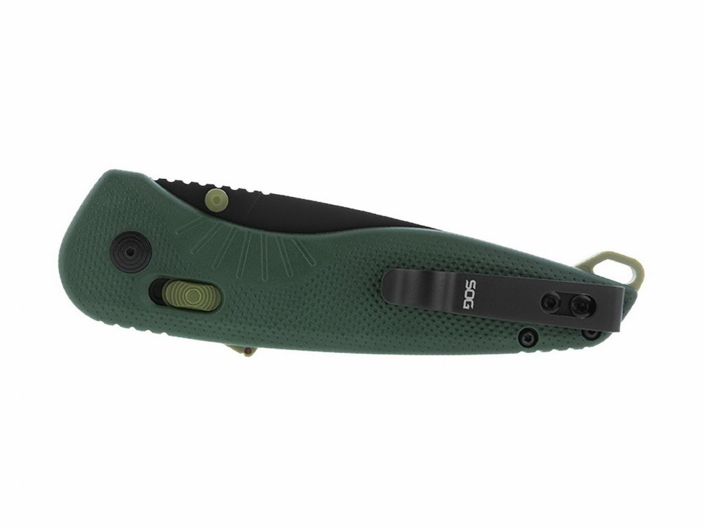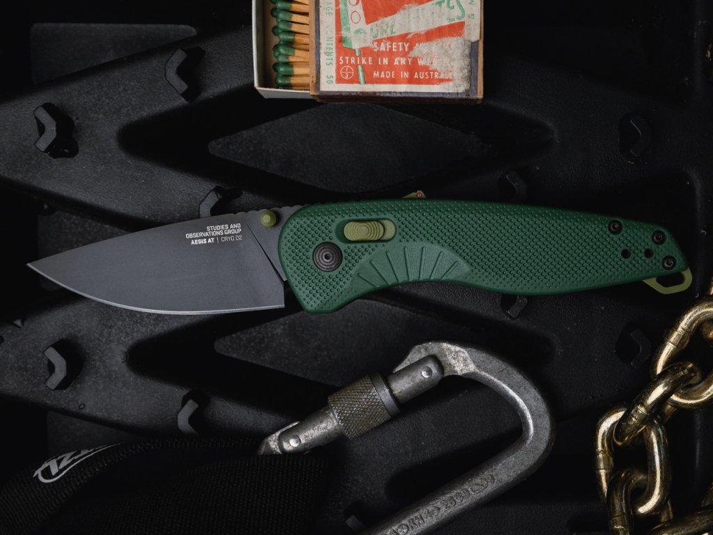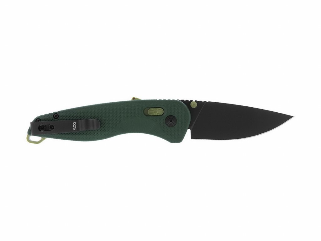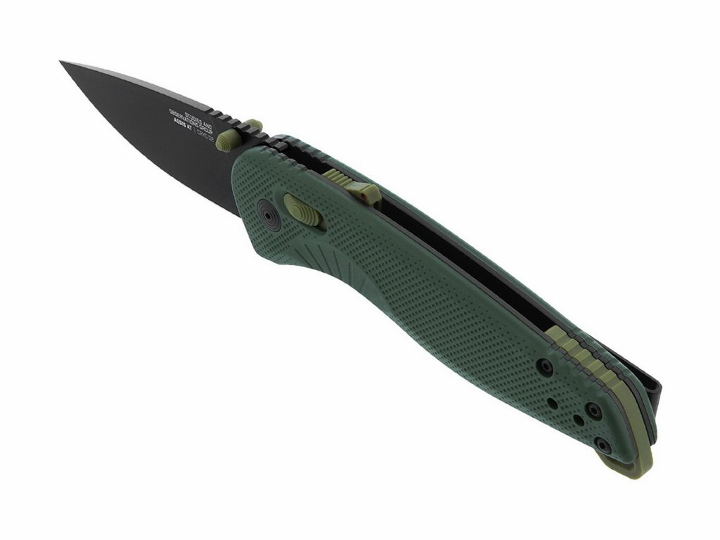 A kültéri használatra tervezett bicska, az Aegis AT kés gyors nyitási segédletet és innovatív, kétkezes SOG AT-XR zárat tartalmaz. A penge kriogénkezelt D2 szerszámacélból, lapos élezésű, 7,9 cm hosszúsággal és titán-nitrid felületkezeléssel. A markolat zöld GRN-ből (erős és tartós kompozit anyagból) készülnek, csúszásmentes felületkezeléssel. Kétoldalas kapocs rozsdamentes acél kés felakasztásához. Egykezes nyitás a pengén lévő csappal.