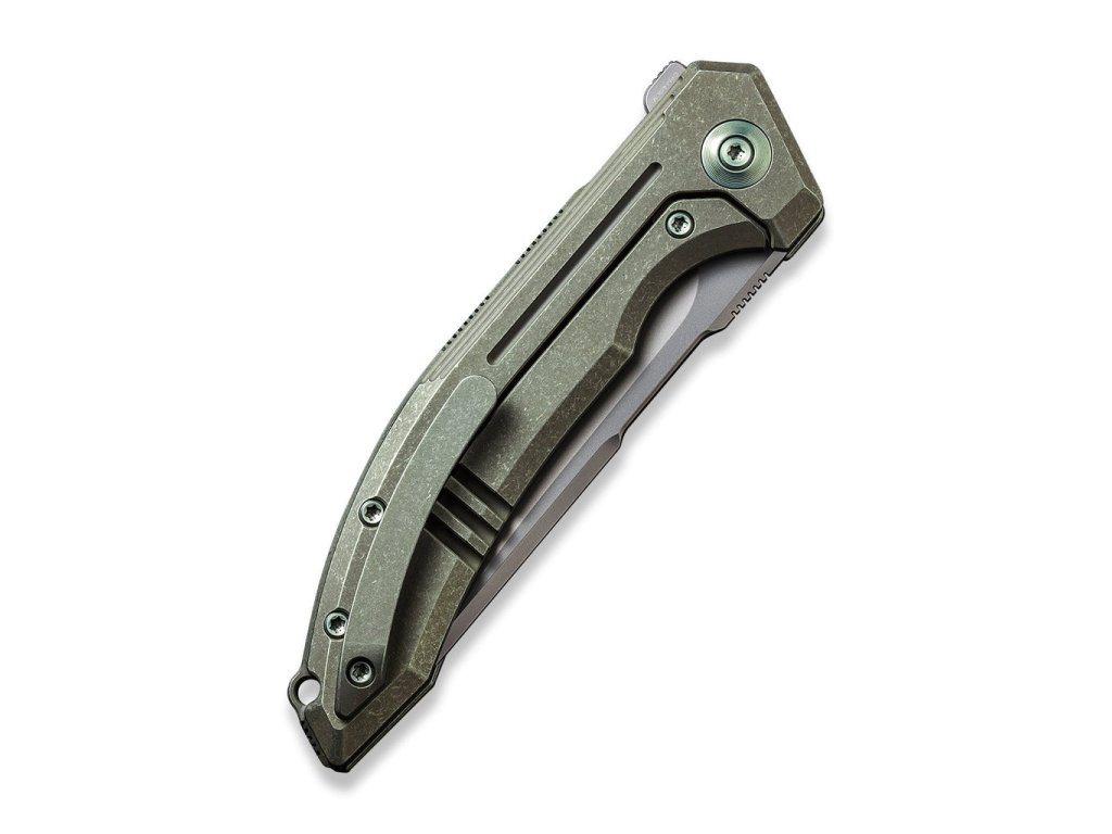 A zöld titánium markolat elegánsan ívelt és tökéletesen illeszkedik a kézbe. A kés klipsz és a csavarok is titánból készültek. A flipperrel történő nyitás rendkívül egyszerű, a kerámia golyóscsapágyak alapfelszereltség.