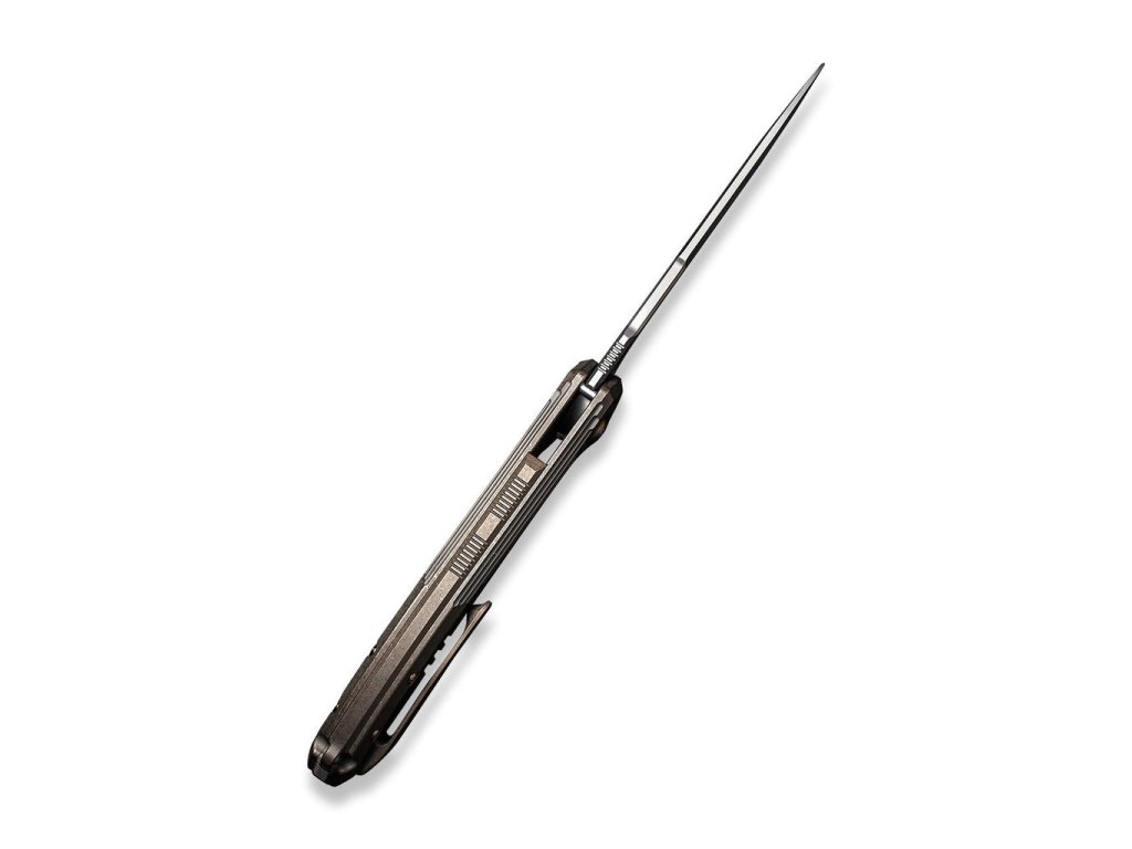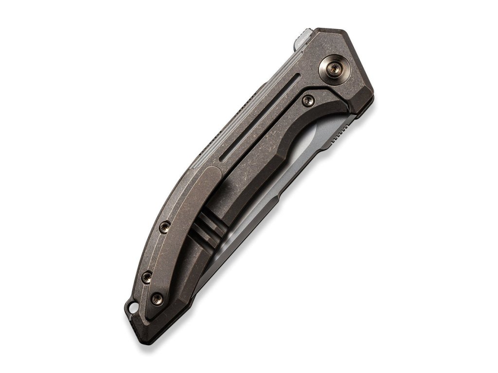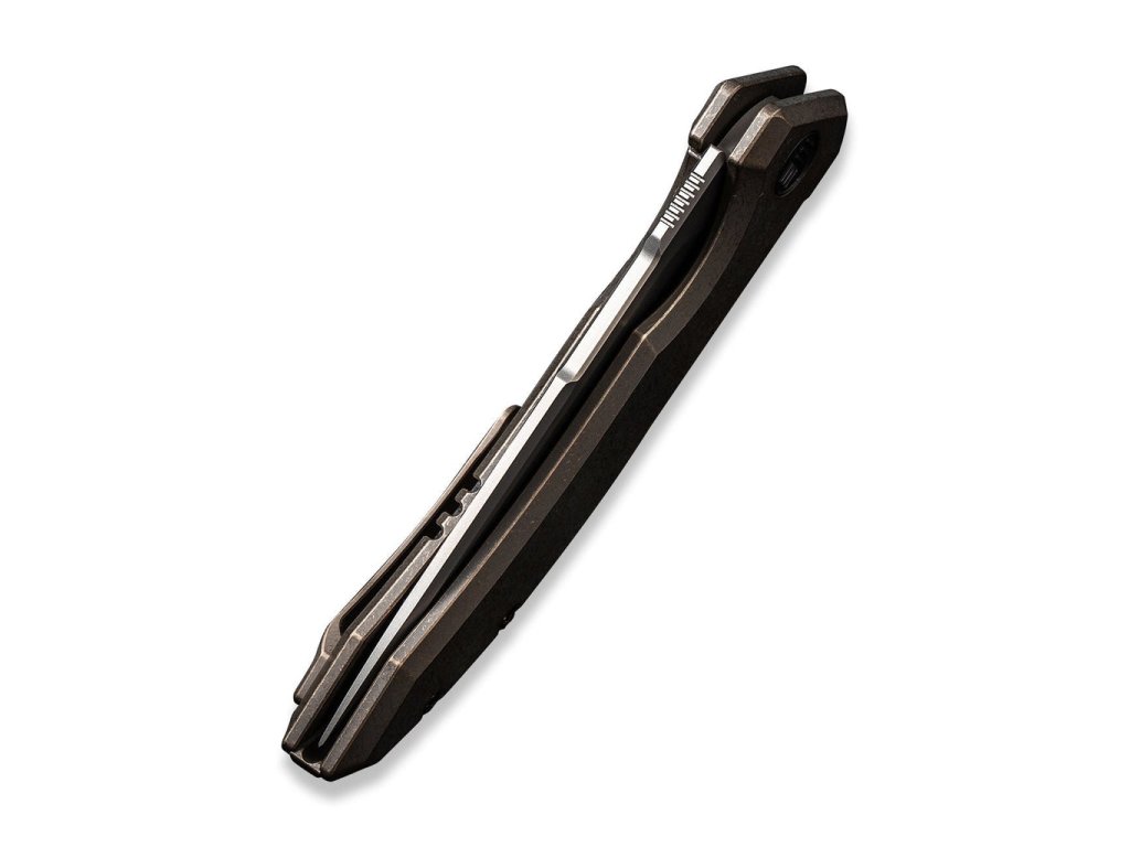 A bronzszínű titánium markolat elegánsan ívelt, így tökéletesen illeszkedik a kézbe. A kés klipsz és a csavarok is titánból készültek. A flipperrel történő nyitás rendkívül egyszerű, a kerámia golyóscsapágyak alapfelszereltséghez tartoznak.