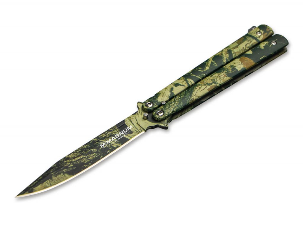 Böker Magnum Balisong Camo pillangókés, amely két, akár 180 fokkal elforgatható markolatból áll. A penge és a markolat terepszínű mintával díszített. A többcélú kés nagyszerű társ lesz a mindennapokban.