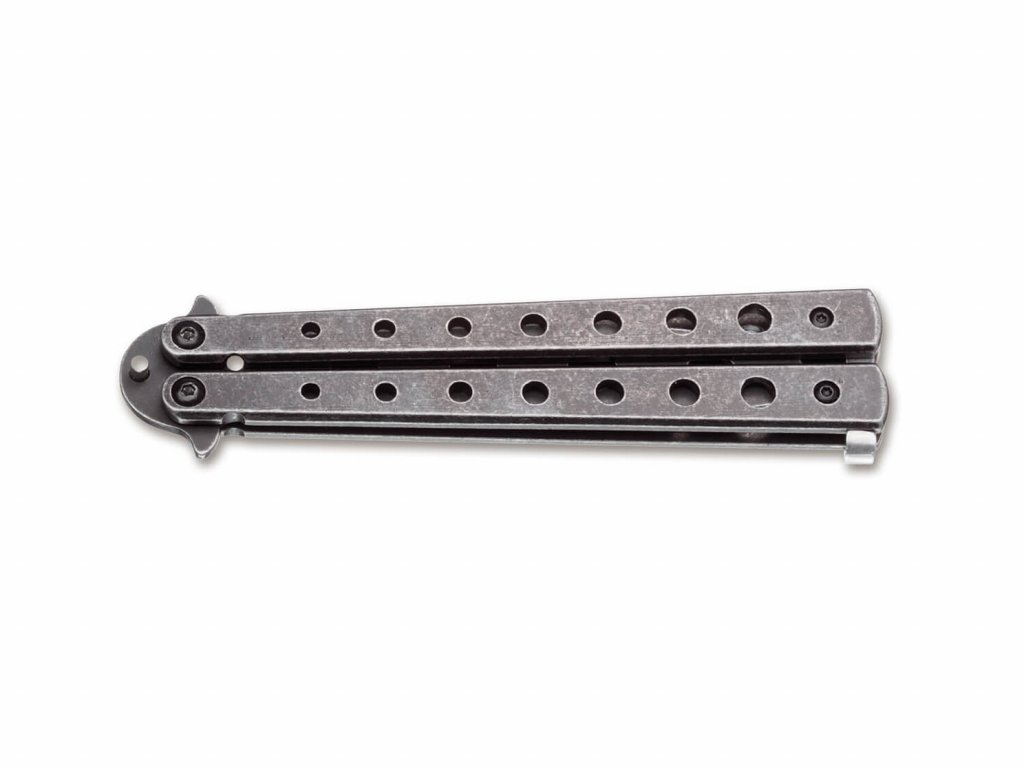 Edző pillangókés a Magnum by Böker márkától. Ez a pillangókés tompa, élezetlen és edzetlen pengével.Sok európai országban tilos éles pengével rendelkező pillangókést birtokolni, ezért ezek a gyakorló változatok népszerűek az európai késrajongók körében, akik szeretnék kipróbálni ezt a típusú kést.< /p>