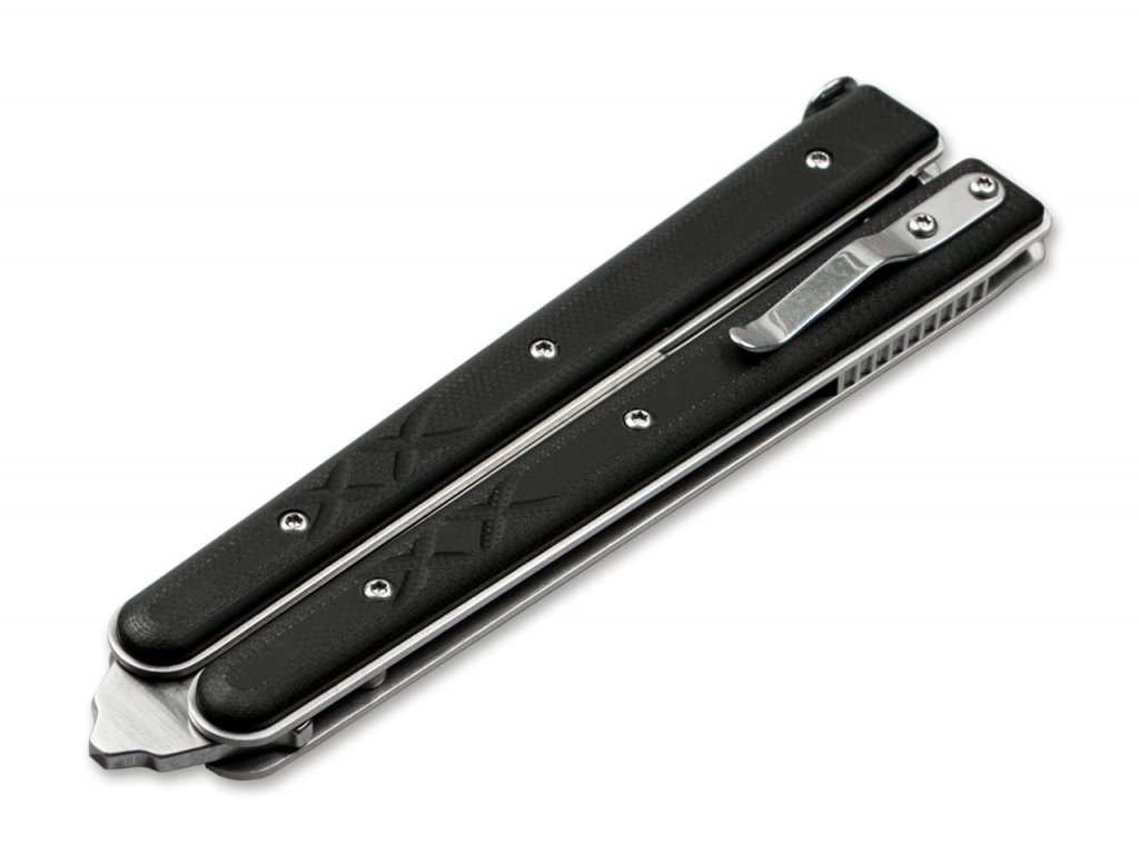 Pillangó kés a német Böker Plus márkától. Rozsdamentes acél penge 440C hossza 10,7 cm kombinált kiélezéssel. G10 markolatk, rozsdamentes acél, függeszték.