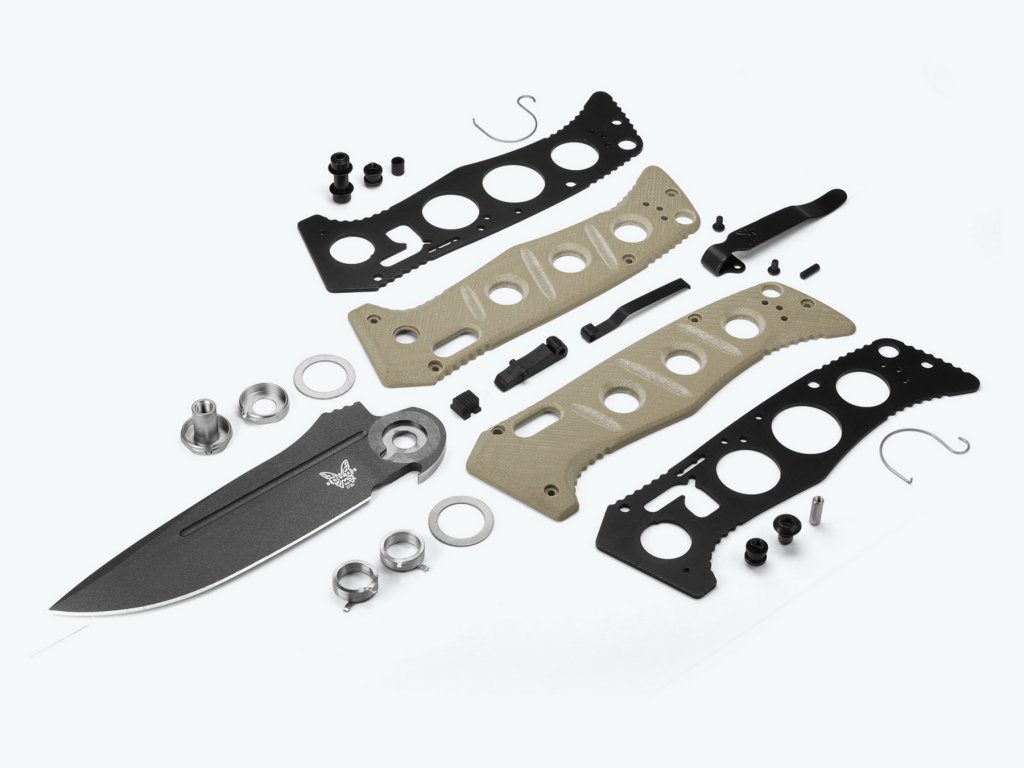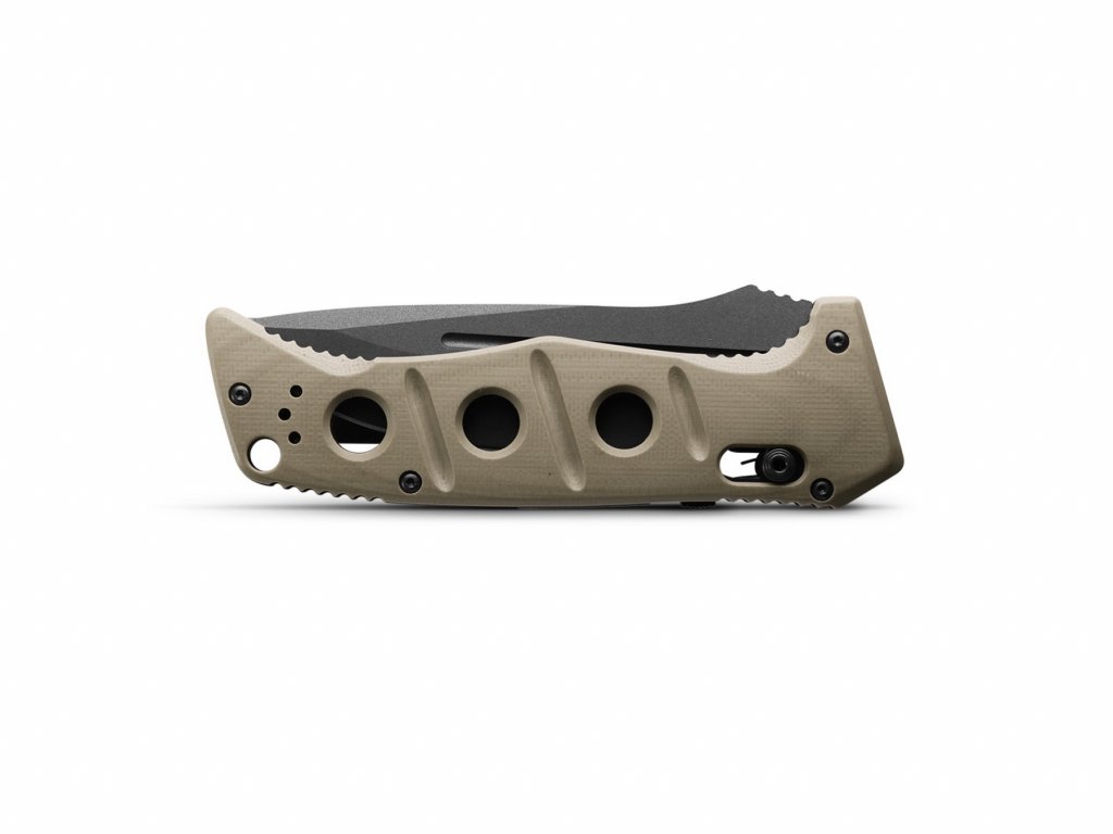 A markolat G10-ből készült, sivatagi barnás színű, jellegzetes lyukakkal, amelyek könnyebbé teszik a kést. A kés mindkét oldalán megfordítható akasztókapoccsal és egy nyakpántlyukkal rendelkezik. A késhez egy övcsipesszel ellátott ballisztikus nejlon tok tartozik. Tengelyzár. A kés az USA-ban készült.