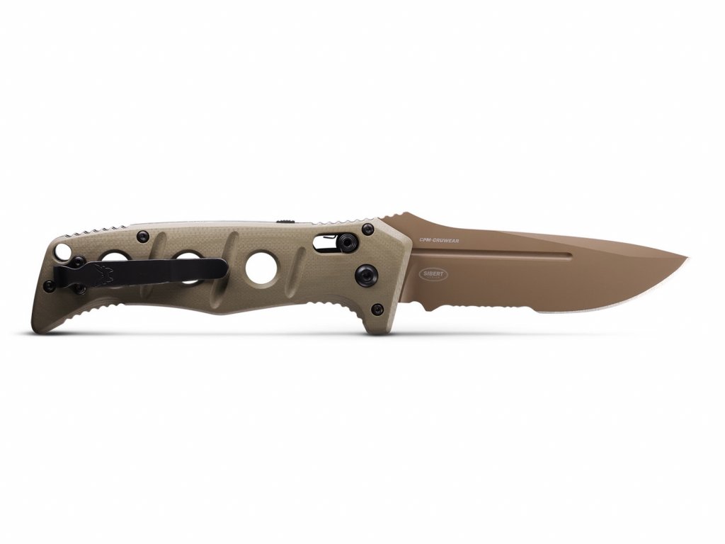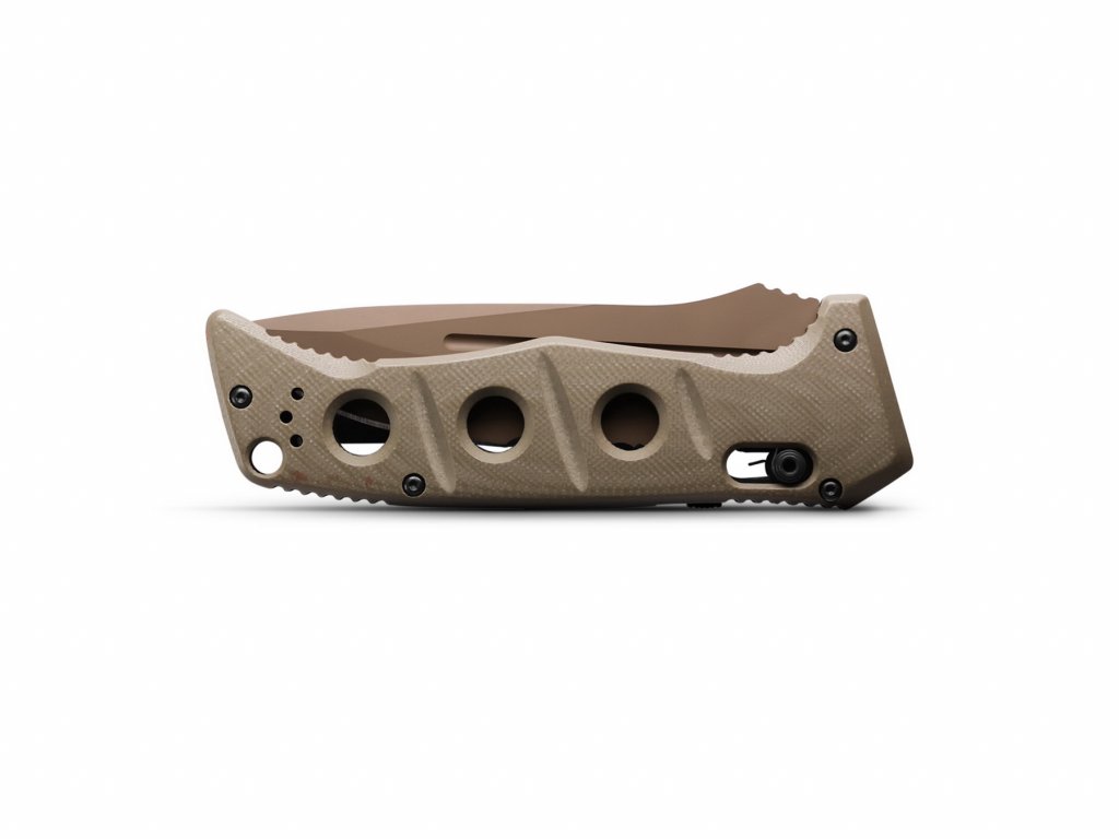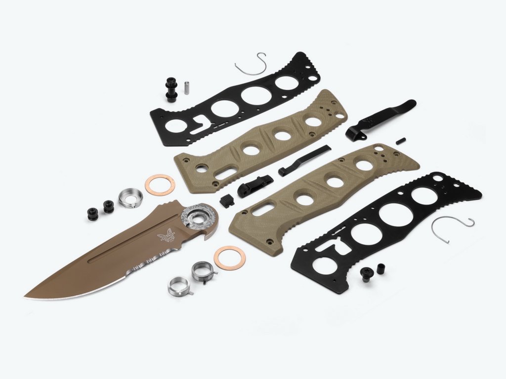 Az olajzöld színű G10 markolat jellegzetes lyukakkal rendelkezik, amelyek könnyebbé teszik a kést. A kés mindkét oldalán megfordítható akasztókapoccsal és egy nyakpántlyukkal rendelkezik. A késhez egy övcsipesszel ellátott ballisztikus nejlon tok tartozik. Tengelyzár. A kés az USA-ban készült.