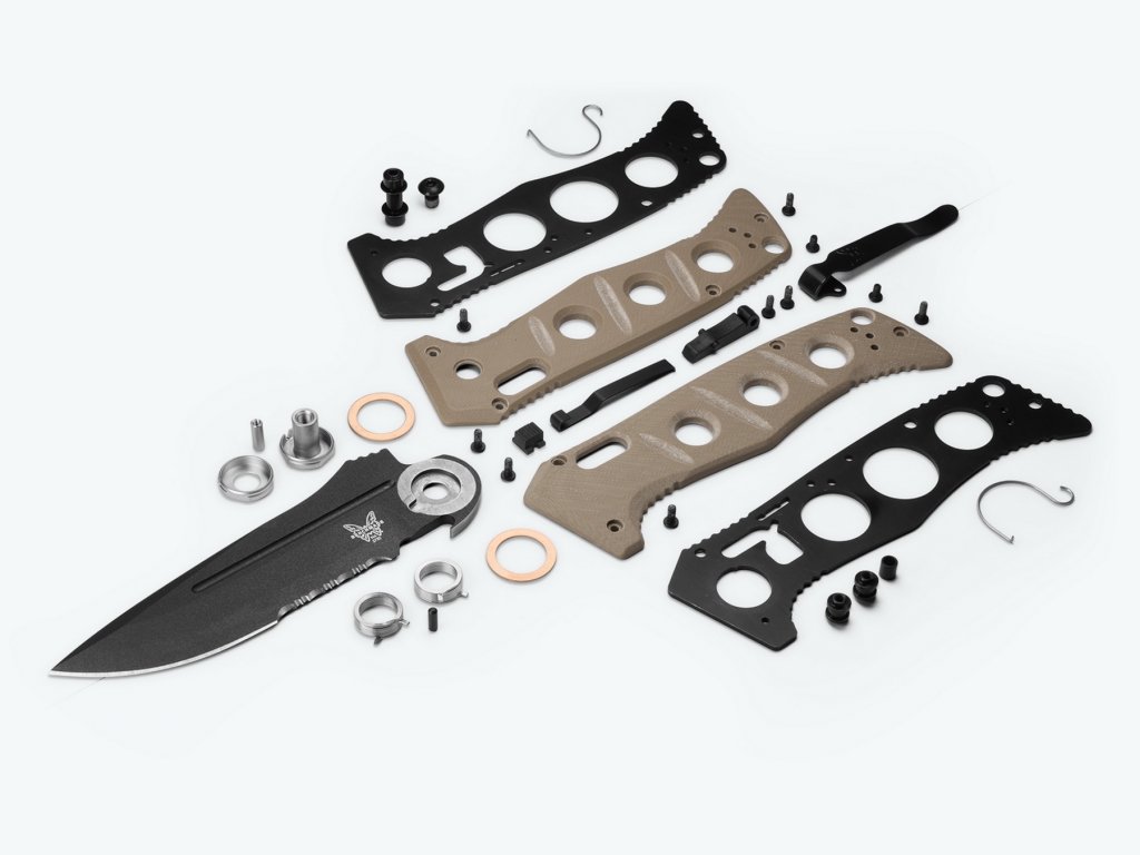 A markolat G10-ből készült, sivatagi barnás színű, jellegzetes lyukakkal, amelyek könnyebbé teszik a kést. A kés mindkét oldalán megfordítható akasztókapoccsal és egy nyakpántlyukkal rendelkezik. A késhez egy övcsipesszel ellátott ballisztikus nejlon tok tartozik. Tengelyzár. A kés az USA-ban készült.