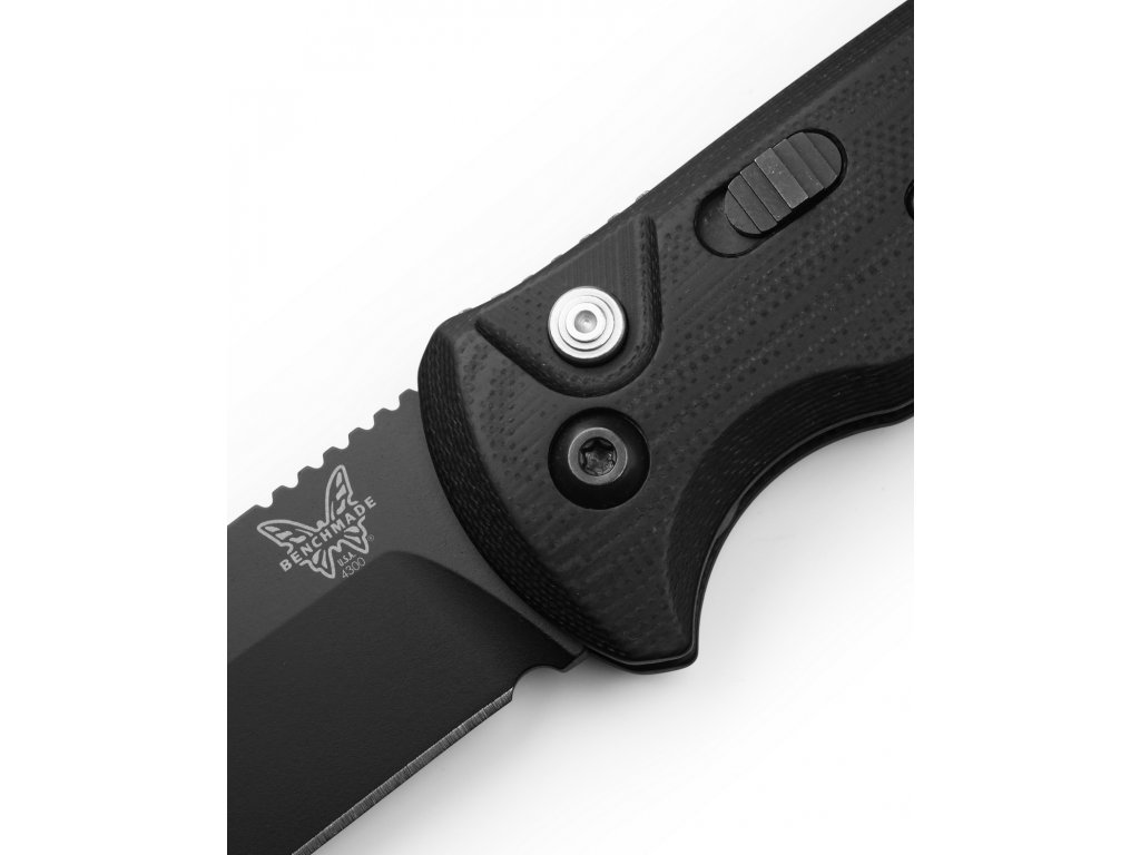 A markolat kontúrozott fekete G10, amely egy rendkívül tartós kompozit anyag. A kés egy fekete kivitelű akasztókapoccsal rendelkezik, amely mindkét oldalon megfordítható. A kés biztonságos használatát nyomógombos biztosíték biztosítja. A kés az USA-ban készült.