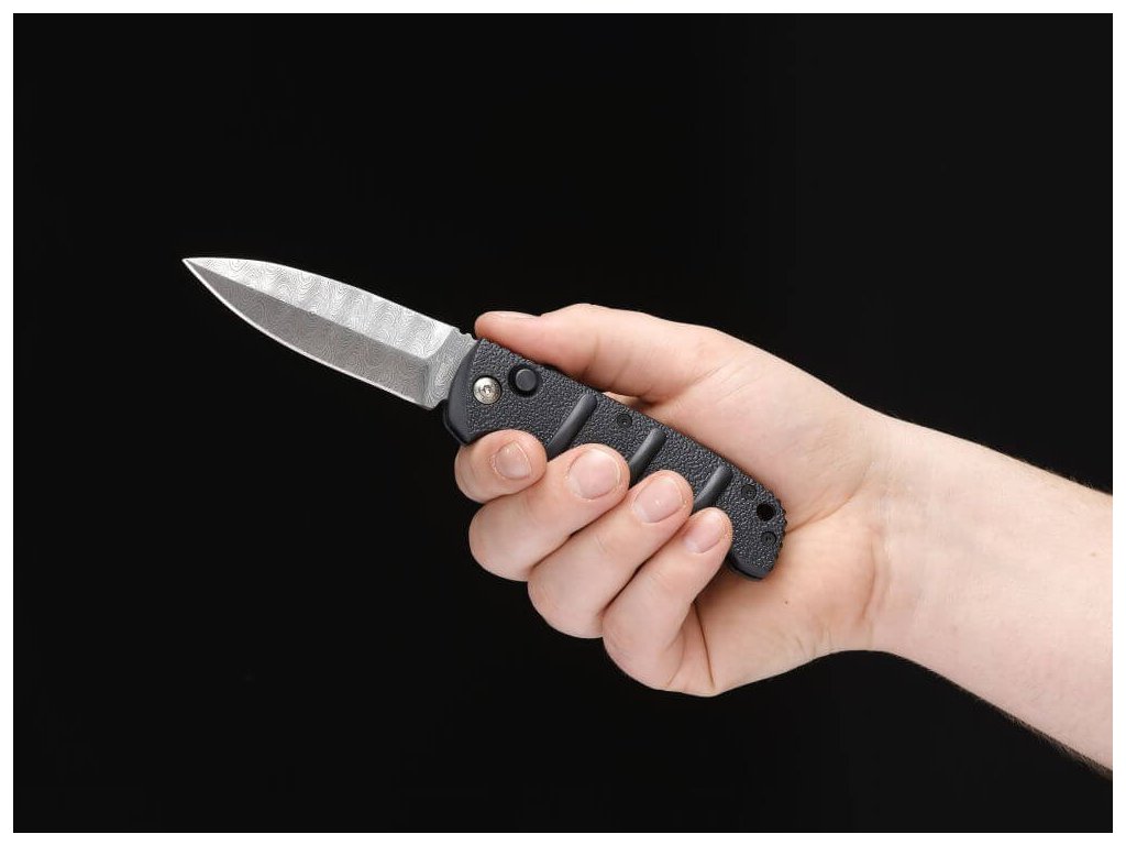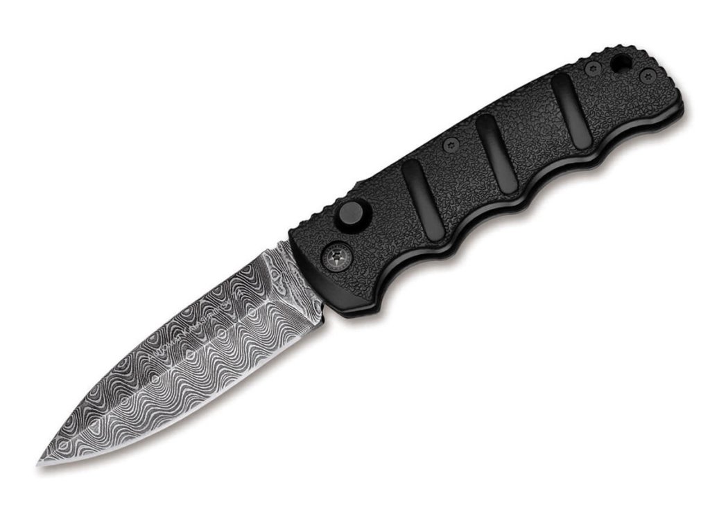 A kovácsolt damaszkuszi acélból készült lándzsahegyes penge egy gombnyomásra nyílik, amelyet a markolat hátulján található további biztonsági elem biztosít. Ezen kívül a kés zsebben mélyen hordozható klipesszel és a zsinór befűzéséhez szükséges lyukkal van ellátva.