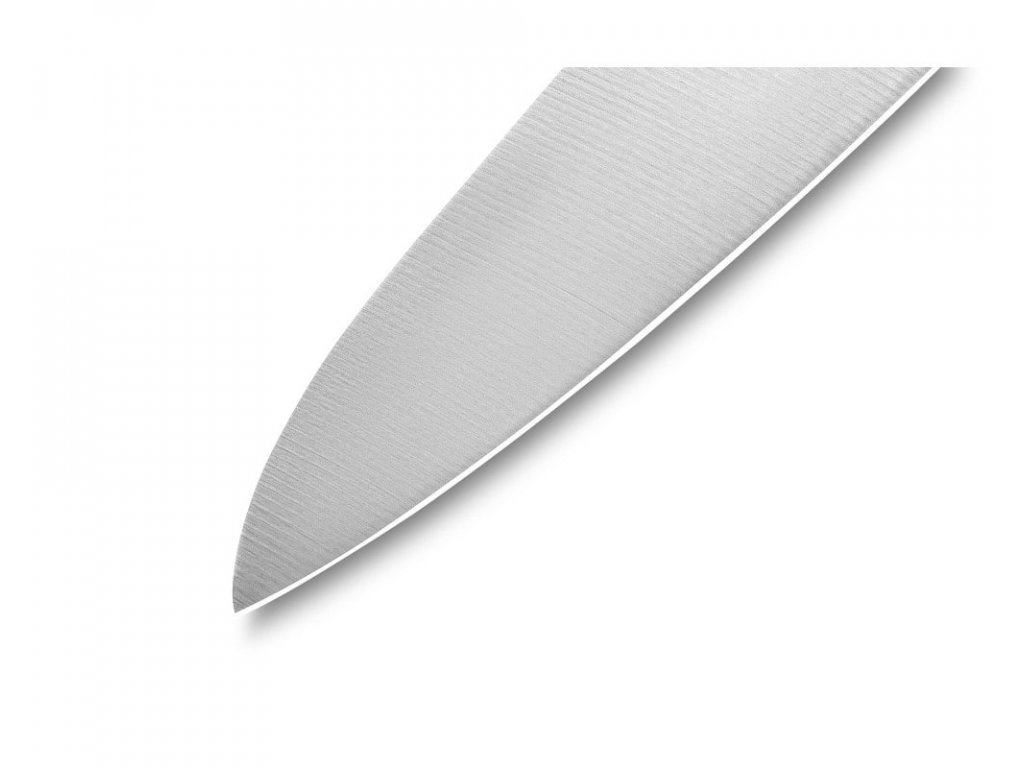 Konyhai kés 20 cm hosszú pengével, kiváló minőségű japán rozsdamentes acélból AUS-8. A G10 kompozit anyagból készült markolat erős, tartós és kellemes tapintású. Séfkés széles és ívelt pengével a gyors és hatékony szeleteléshez. A kést egy szép papír-műanyag dobozba csomagolják