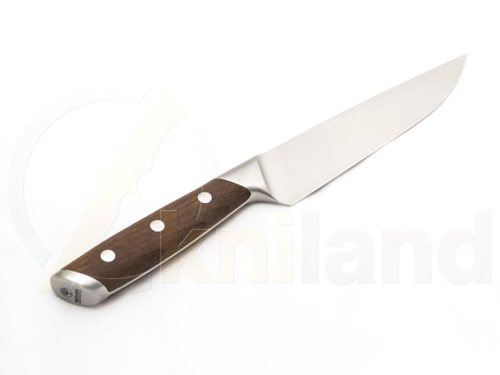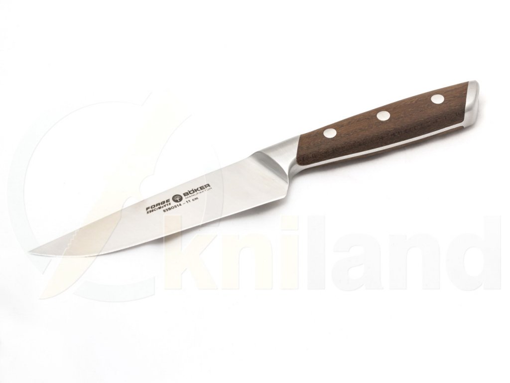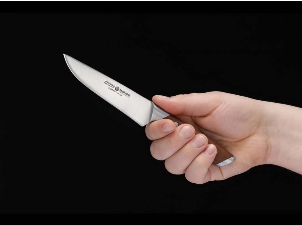 A Forge modellsorozatból származó luxus Böker konyhai kés. Univerzális kés a mindennapi konyhai tevékenységekhez. A kés konstrukciója integrált, X50CrMoV15 króm-molibdén-vanádium acélból, amely ellenállóbb, és jobban tartja az élességet, mint a hagyományos konyhai kések. A penge 11 cm hosszú, a kés teljes hossza 22 cm. A juharfából készült markolatnak köszönhetően attraktív a kivitelezése. A kés elegáns díszdobozban érkezik.