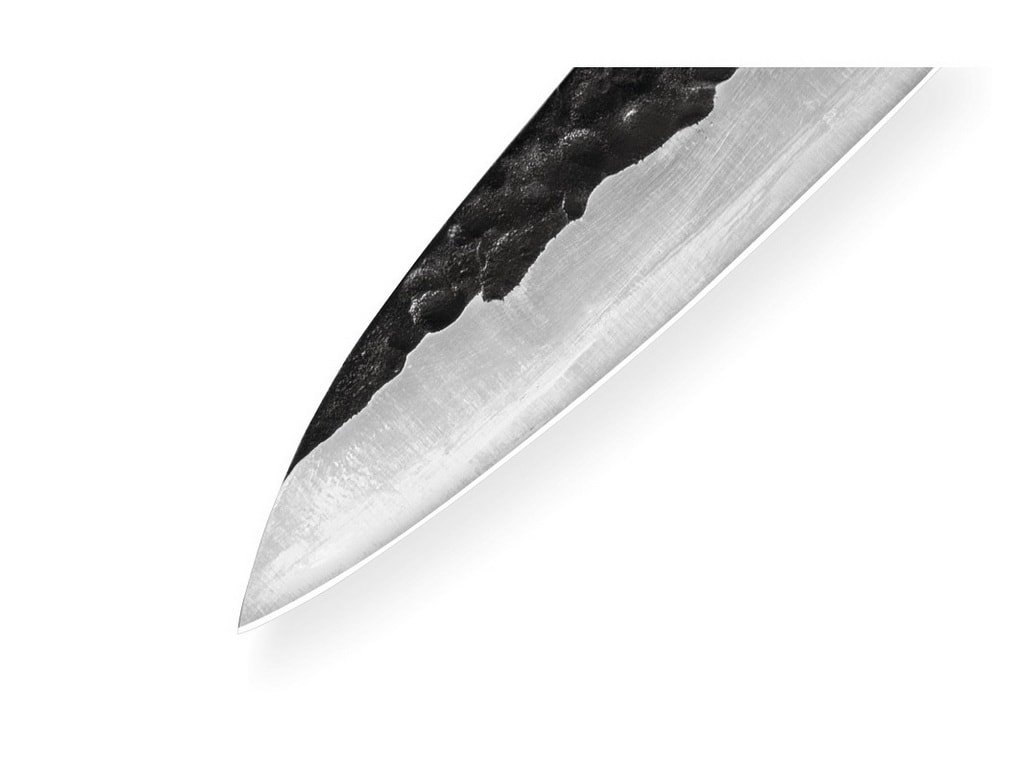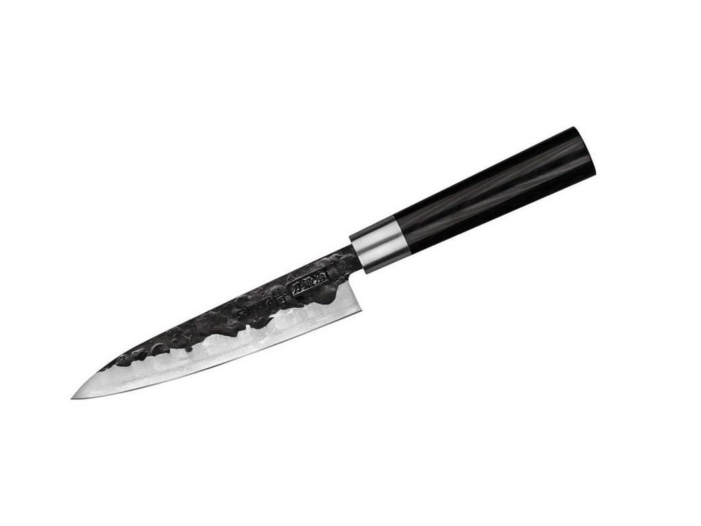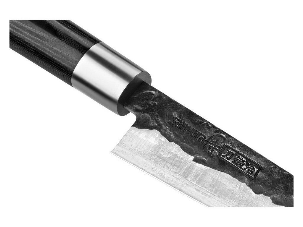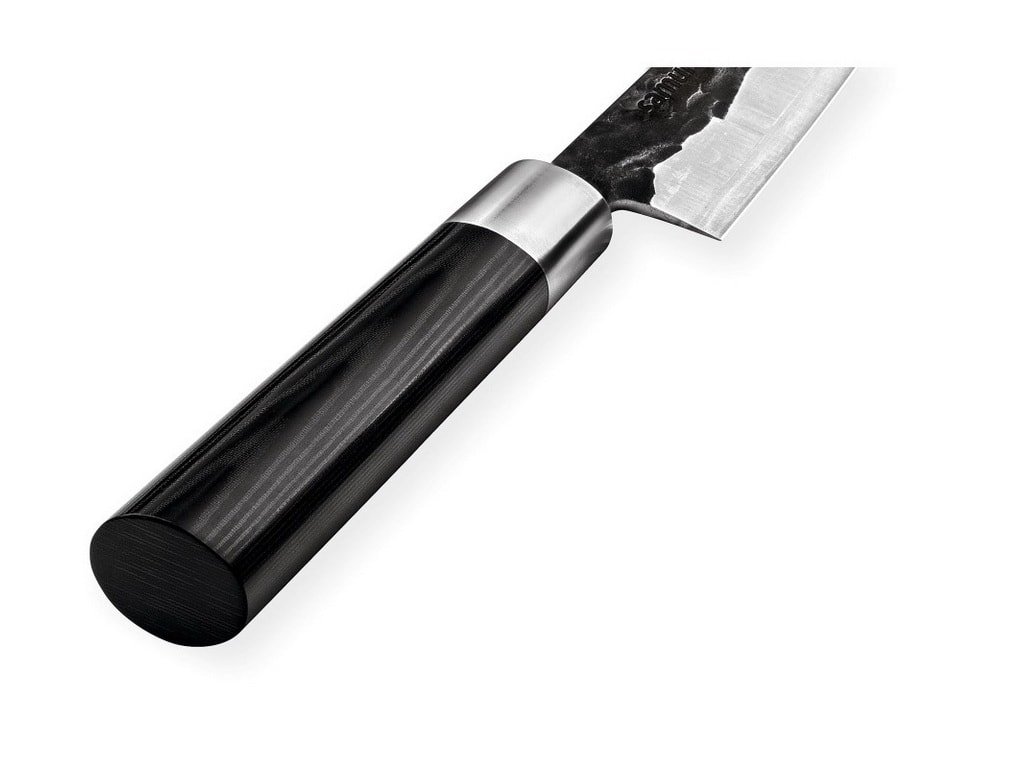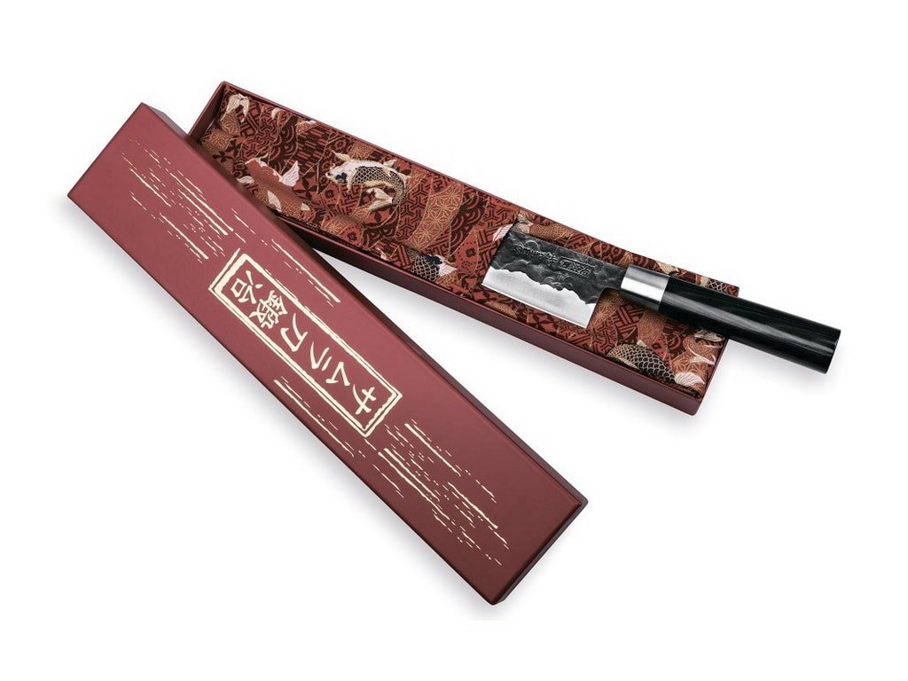 A Samura Blacksmith kések exkluzív konyhai kések, amelyek hagyományos japán formákat kínálnak, tartós micarta kompozit markolattal és kézzel kovácsolt japán AUS-8 rozsdamentes acél pengével. A kézi kovácsolt acél előnye a nagy tartósság és megbízhatóság, valamint a szokatlan megjelenés, mivel minden darab eredeti. A hammered steel felületkezelés nagyon vonzó és biztosítja a sima vágást anélkül, hogy a szeletelt étel tapadna a késhez. A kés egy nagyon szép japán stílusú vászon tasakba van csomagolva, aztán ajándékdobozba.