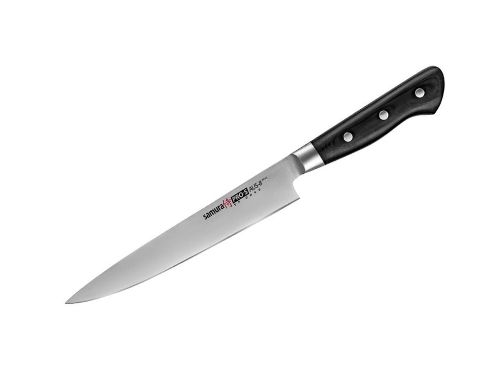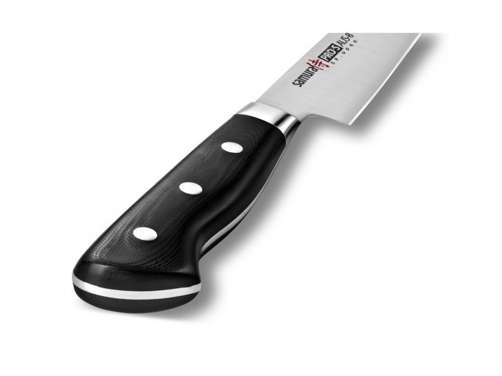 Nagy konyhakés 20 cm hosszú pengével, kiváló minőségű japán AUS-8 rozsdamentes acélból. A G10 kompozit anyagból készült markolat erős, tartós és kellemes tapintású. A kést főleg akkor használhatja, amikor vékony hússzeleteket, sonkát stb. Szeletel. A kést egy szép papír-műanyag dobozba csomagolják.