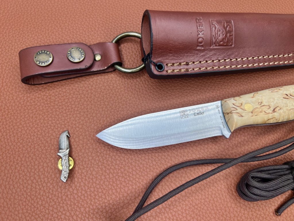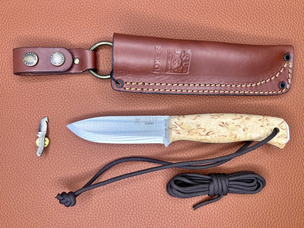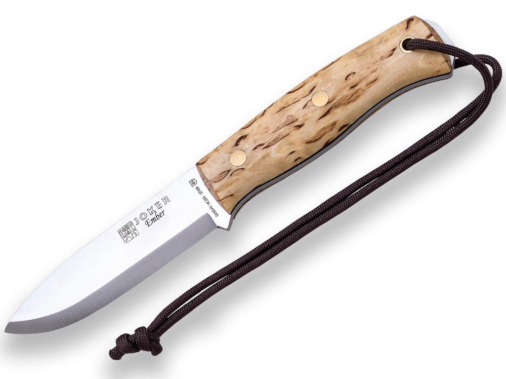 A Joker Ember egy közepesen méretű outdoor kés. Ez egy univerzális kés erdőbe, amely minden tevékenységgel megbirkózik. A kés nem tartalmaz felesleges részleteket, minden adaptálva van a maximális funkcionalitáshoz a természetben. A full tang konstrukciója biztosítja, hogy erős és megbízható. A penge Sandvik 14C28N rozsdamentes acél, matt felületkezeléssel, hossza 10,5 cm scandi leélezéssel. Markolata göndör nyírfa. A késhez kiváló minőségű bőrtok tartozik, amely lehetővé teszi a magas és alacsony felfüggesztését az övre.