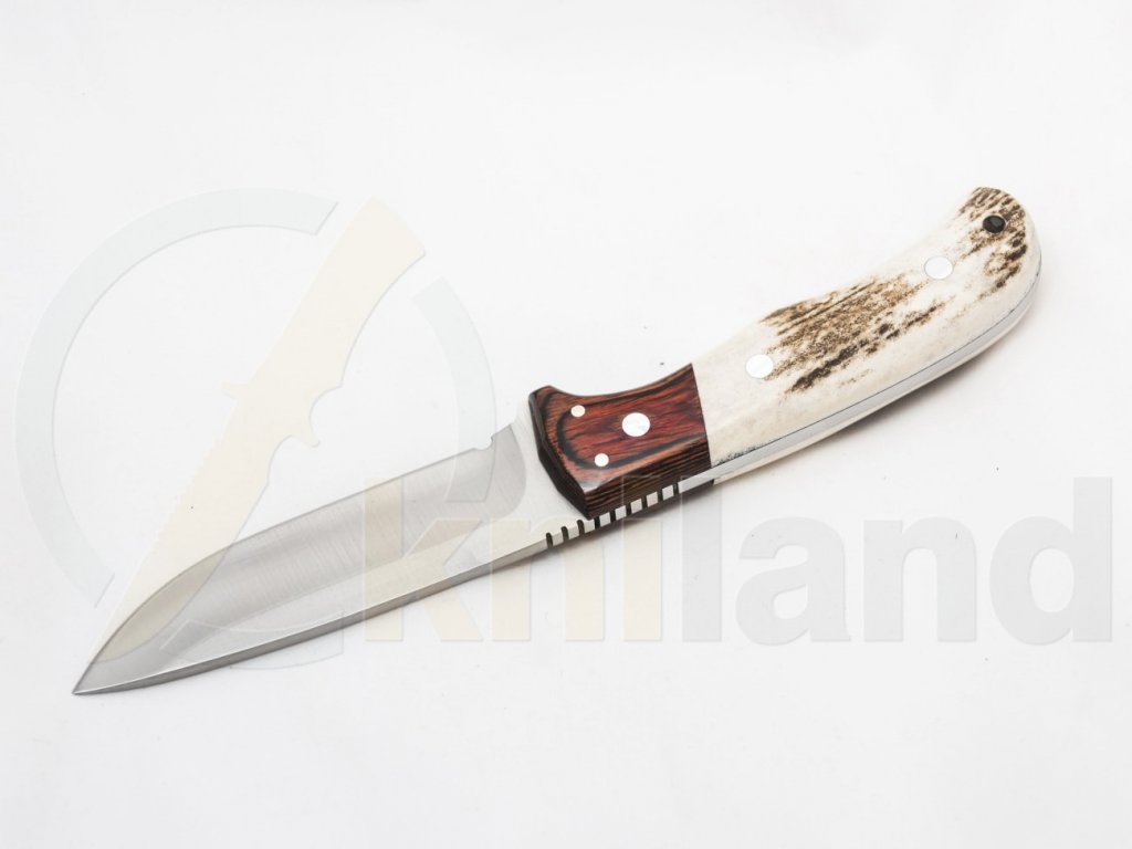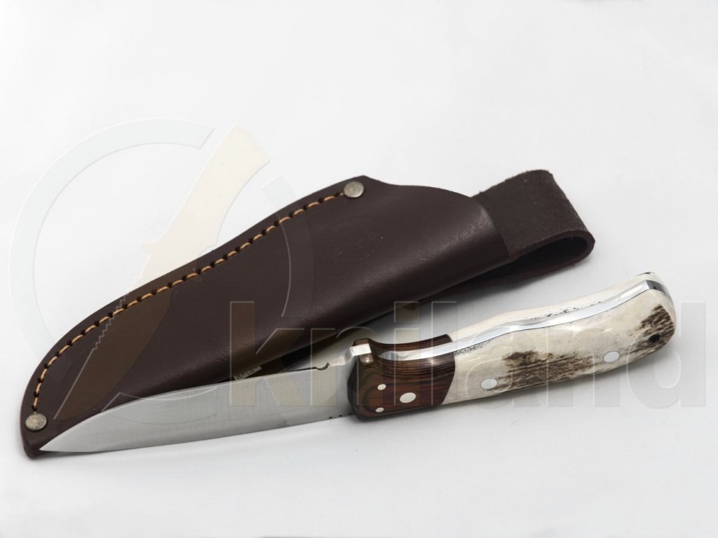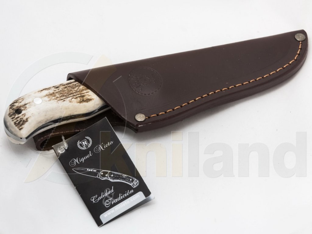 Miguel Nieto kés, alkalmas kültéri és mindennapi használatra. Markolata agancs, bőrtok. 1.4116 rozsdamentes acél penge, keménysége 58-60HRC.