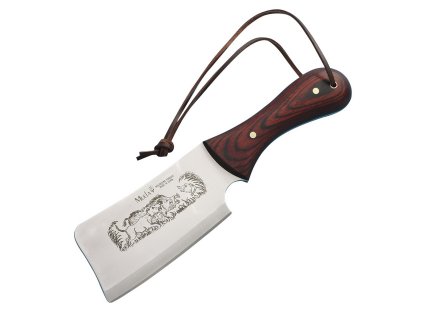 Rozsdamentes acélból készült bárd, X50CrMoV15. A penge hossza 13,5 cm, teljes hossz 27 cm. Elegáns fa markolat. Barna bőr tok.