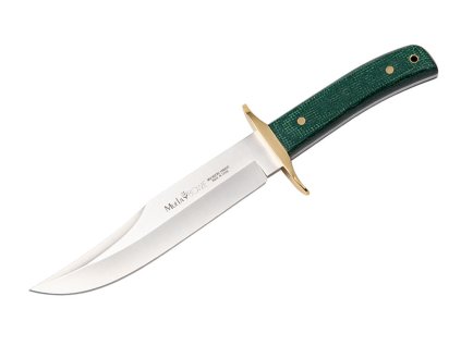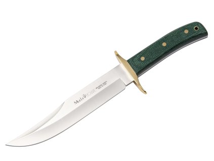 Természetjáró kés X50CrMoV15 rozsdamentes acélból. A penge hossza 19 cm, teljes hossz 31 cm. Markolat zöld micartából, sárgaréz keresztvédelemmel. Fekete bőr tok.