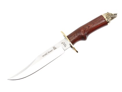 Elegáns vadászkés X50CrMoV15 rozsdamentes acélból. A kés pengéje 16 cm hosszú, a teljes hossz 29 cm. A markolat fából készült, melynek végén egy vaddisznó motívum található....