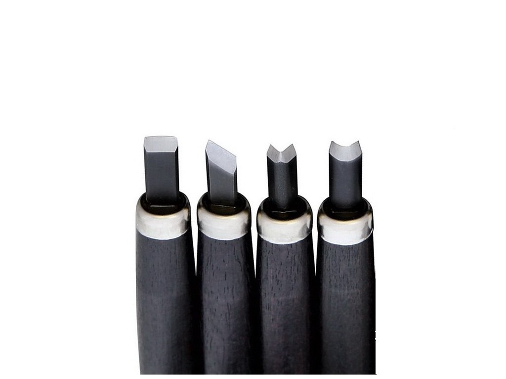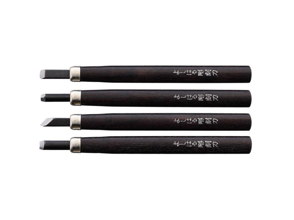 Négyrészes Yoshiharu japán faragóvésőkészlet. A pengék kétrétegű szénacélból készültek. Az alsó réteg (penge) szénacél, amely nagyon kemény és rendkívül élesre élezett. Az ilyen acél azonban meglehetősen törékeny, ezért egy puhább és tartósabb acélból készült felső réteg védi. Az eredmény olyan vésők, amelyek egyszerre nagyon élesek, könnyen élezhetők és tartósak.
