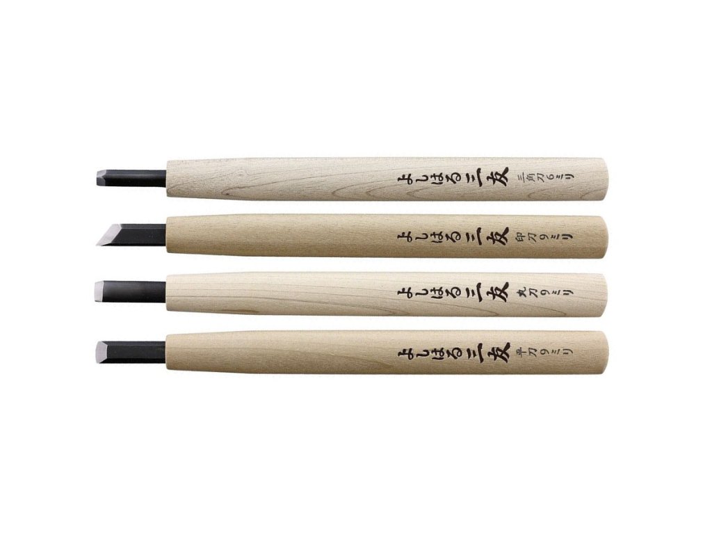 Négy darabos Yoshiharu japán faragóvésőkészlet hosszabb nyéllel. A hosszabb nyélnek köszönhetően úgy tarthatja őket, mint egy ceruzát, ami precíz faragást tesz lehetővé. Ezek tipikus japán faragóvésők, amelyeket a Yoshiharu kis manufaktúrájában gyártanak, ahol a gyártás még mindig hagyományos módon, nagy arányban kézi munkával történik.